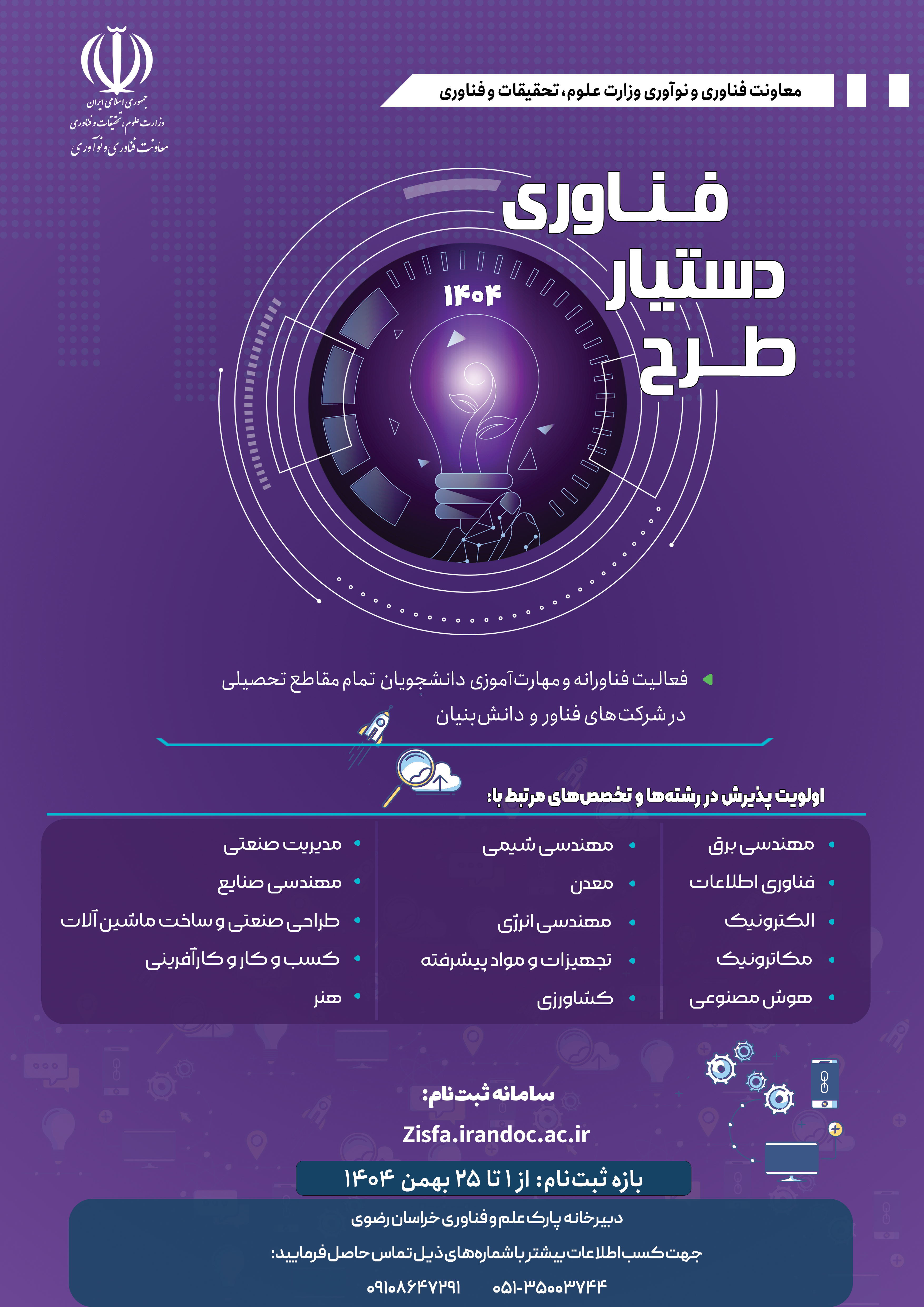 به گزارش روابط عمومی و امور بینالملل پارک علم و فناوری خراسان رضوی، بنابر اعلام وزارت علوم، معاونت فناوری و نوآوری وزارت علوم تحقیقات و فناوری با راهبری دانشگاهها و پارکهای علم و فناوری استانی، چهارمین طرح ملی دستیار فناوری را با تاکید بر مهارتآموزی دانشجویان شاغل به تحصیل در رشتههای مهندسی برق، فناوری اطلاعات، الکترونیک، مکاترونیک، هوش مصنوعی، مهندسی شیمی، معدن، مهندسی انرژی، کشاورزی، مدیریت صنعتی، مهندسی صنایع، هنر و کسب و کار و کارآفرینی، طراحی صنعتی و ساخت ماشینآلات، تجهیزات و مواد پیشرفته را در سامانه جامع زیست بوم فناوری و نوآوری به نشانی zisfa.irandoc.ac.ir//:https به اجرا درآورد.