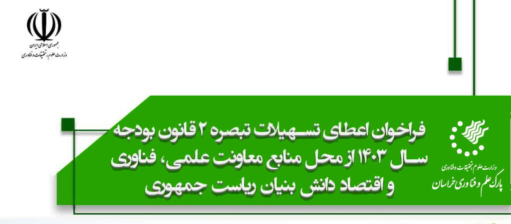 به گزارش روابط عمومی و امور بین‌الملل پارک علم و فناوری خراسان رضوی، در راستای حمایت از زیست‌بوم نوآوری و با هدف توسعه تولید و اشتغال، فراخوان اعطای تسهیلات موضوع تبصره ۲ قانون بودجه سال ۱۴۰۳ کل کشور از محل منابع معاونت علمی، فناوری و اقتصاد دانش‌بنیان ریاست جمهوری اعلام شد. ​